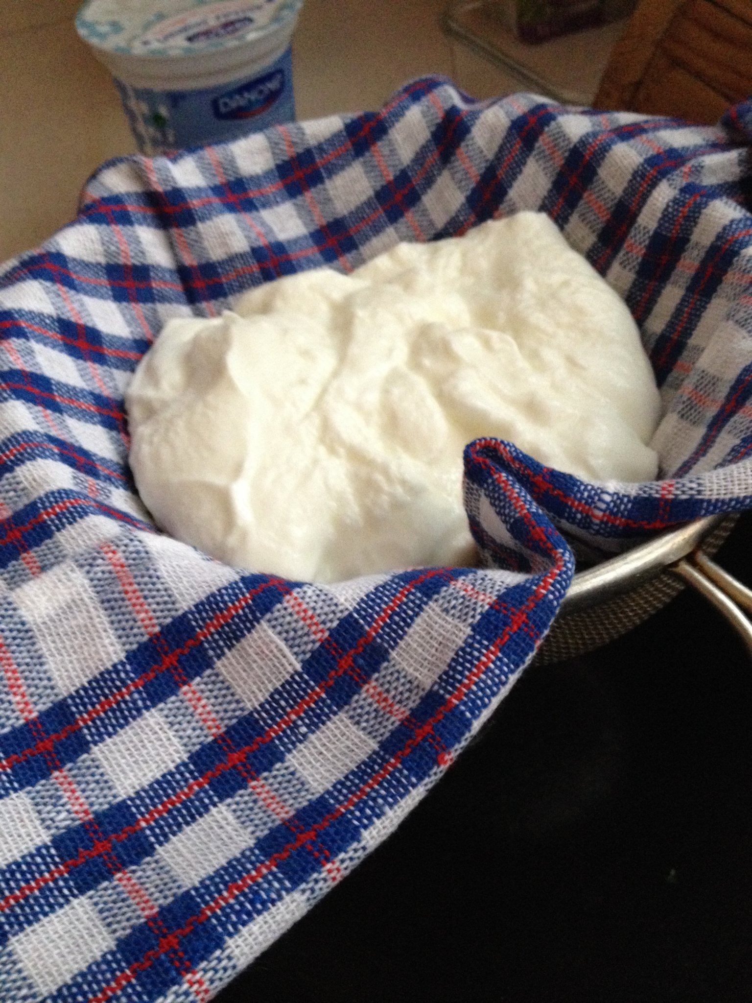 Most jön a csavar! A 2 natur joghurtból görög jellegű “krémet” készítünk! Azt pedig úgy csináljuk, hogy vegyünk egy tálat, ráhelyezünk egy szűrőt a szűrőbe egy konyharuhát. Ha ez meg van akkor bele helyezük a natur joghurtot, és lecsöppögtetjük! Időként meg kell kevergetni! Nem egy gyors folyamat és ne ijedjünk meg, elég sok folyadék fog távozni!